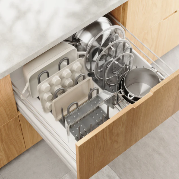 - Despensa/Cozinha: Prateleiras de arame são ideais – permitem a circulação de ar e facilitam a limpeza de respingos. Adicione forros de prateleira para itens pequenos.